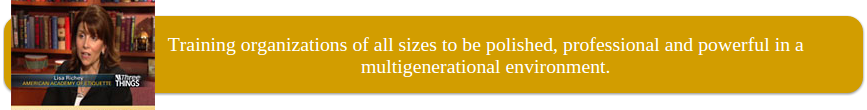 HR professionals and sales organizations, contact me to speak on topics such as personal branding, how to build stronger and better relationships with clients and colleagues, ways to connect the multi-generations that make up the workforce and of course how to dine with ease and grace during a business meal.